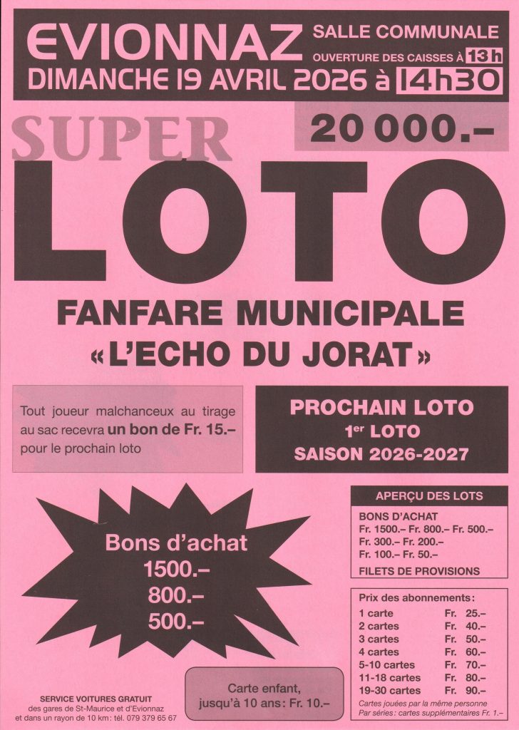 Notre société organise son loto le dimanche 19 avril 2026 à 14h30 à la salle communale d’Evionnaz.